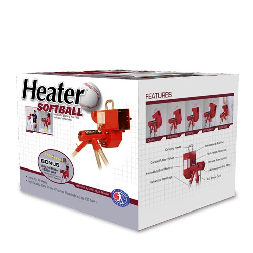 The Heater Softball Pitching Machine from Heater Sports pitches fast and slow pitch softballs at an affordable price. The powerful 1/4 horsepower motor throws 12” softballs at variable speeds up to 52 miles per hour. The auto-ball feeder delivers a softball every 10 seconds. Take batting practice without the need for another player. And with a simple tilt adjustment you can also catch grounders and fly-balls. Plug the Heater into any standard wall outlet or third party battery packs may be avaliable for convenience. You may also consider the optional PowerAlley or Xtender Home Batting Cages and improve your hitting right in your own backyard.